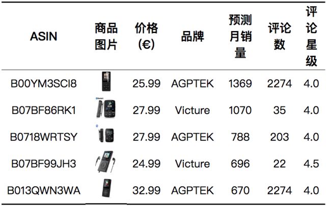本文选取2017年6月亚马逊德站Best Sellers榜单中MP3-Player品类下的Top100商品作为市场研究目标。