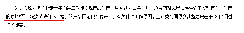 令人注意的是,这一批不合格百白破疫苗并不是新近才发现问题的,而是在去年10月的抽检中就发现了,只不过是在最近吉林省药监局才实施了行政处罚。当时这一批次的疫苗已全部销往山东,共计25.26万支。