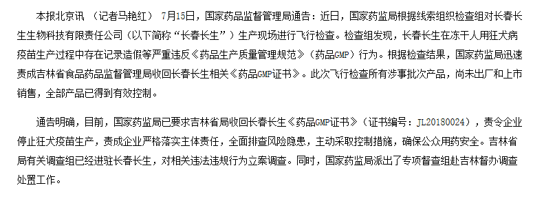 7月15日,国家药监局在官网发布通告称,长春长生生物科技有限责任公司的冻干人用狂犬病疫苗生产存在记录造假等严重违规行为,违法违规生产冻干人用狂犬病疫苗。