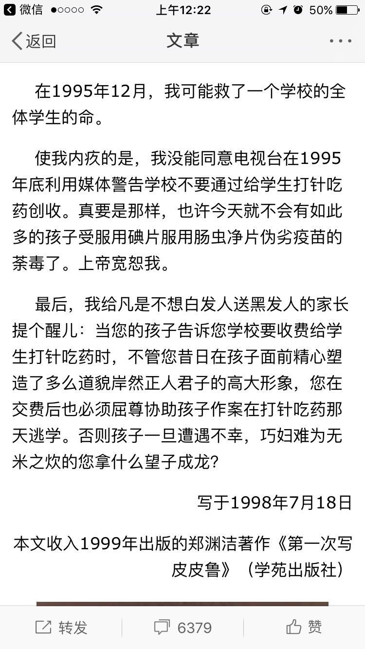 而著名作家郑渊洁也发表长微博,将其1995年孩子经历的伪劣疫苗事件重新翻出: