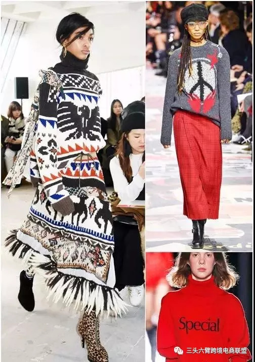 如上图,从Christopher Kane印有“special”的大红套头针织衫,到Prada的长款针织衫,都透露着一股不甘单调的气息。2018年,针织衫的设计花色注定不简单,如果你能为人们提供花色艳丽特别的针织衫,那么定能从竞争对手那多抢回好几笔订单。
