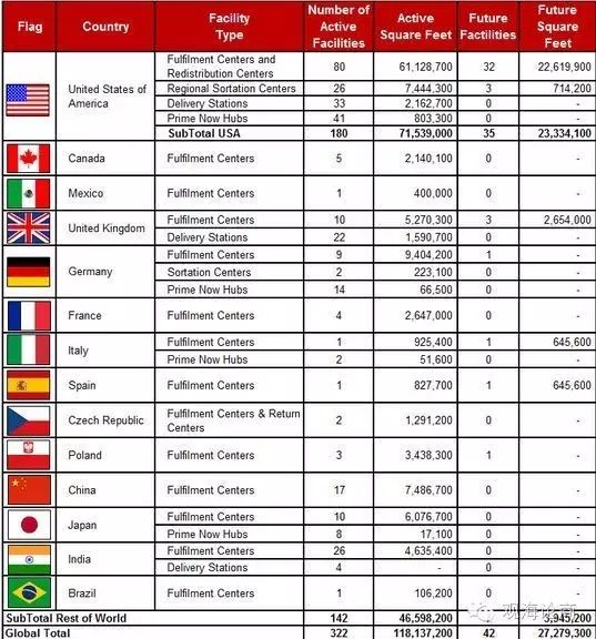 其实在之前做的统计中我们发现,亚马逊的业务已拓展至全球,物流仓储中心更是在全球遍地分布,以下是截止到今年8月份,亚马逊物流仓储中心的分布情况: