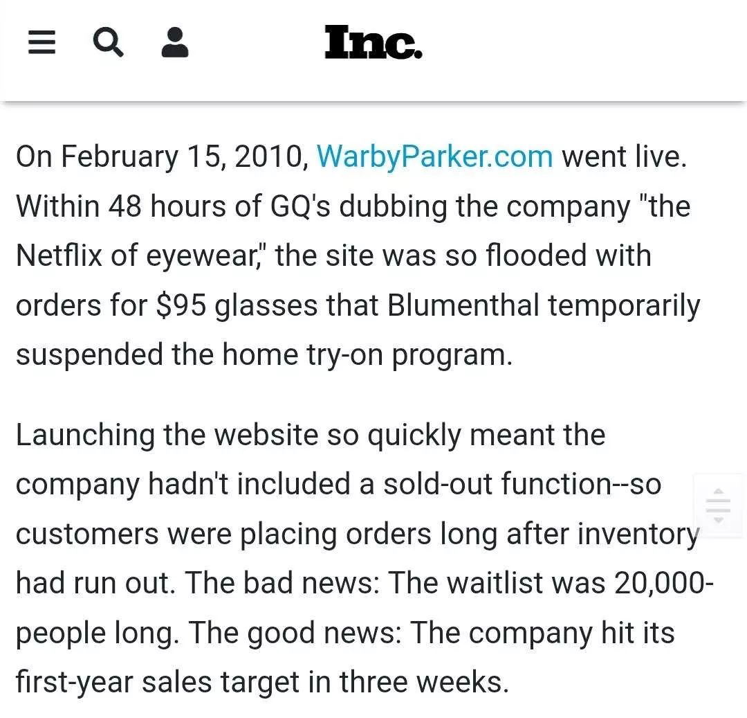 Warby Parker的上线更是非常具有戏剧性!2010年2月15日,WarbyParker.com正式上线。时尚杂志GQ采访了WP的创始人,然后写了一篇文章,文章把Warby Parker称为“眼镜界的Netflix”。幸福来得太突然!在文章发布后的48小时内,他们收到“洪水般涌来的订单”(so flooded with order)。坏消息是,WP的等候名单上已经有了2万个消费者。好消息是:只用了三个星期,就完成了一年的销售目标!