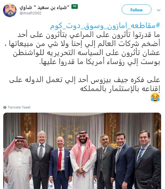 一位名叫Bandar Otyf的沙特记者在推特上对他的10.5万个追随者表示,《邮报》“一贯发表诽谤性的文章。”他还说:“让我们保卫我们的国家……抵制亚马逊,向它的主人发出信息,让他知道损失的规模。”