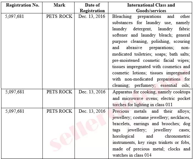 Polyblank Designs Limited公司的PETS ROCK商标,其产品的主要特色就是将电影、音乐、艺术、历史等大名人与猫、狗等小动物们进行结合。通过商标查询发现在2016年的时候PETS ROCK就已经注册了商标。