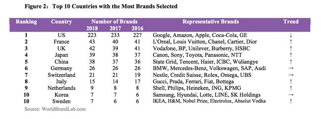 来自欧洲和美国的品牌在这动荡的一年中依然保持了坚挺。从拥有品牌数量的国家来看,美国依然保持世界品牌数量第一,有223个品牌入选,不过该数字比去年下降了10个;分列二、三位的法国和英国分别有43个和42个品牌上榜,这两个国家在2018年各增加了3个品牌。按GDP计算,作为世界第二大经济体的中国有38个品牌入选,比去年增加了1个。
