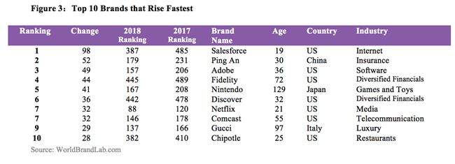 (图为世界500强品牌中10大名次上升速度最快的品牌)