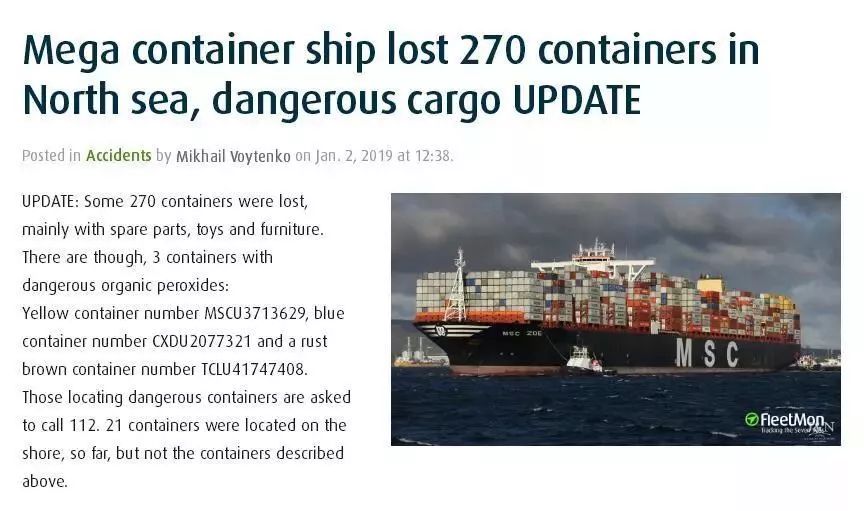 截至1月3日的信息,事故造成大约270个集装箱丢失,主要货品有电子产品,汽车零件,家具,服装和玩具,甚至还可能有其他损失!