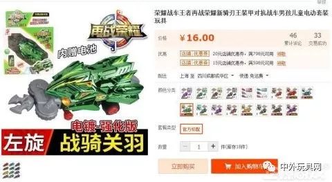 再看这款荣耀战车,满满的原谅色调,24K纯电动,后驱独轮驱动,只要16元!放佛是在诉说,山寨我们是认真的!童叟无欺,王者荣耀盗版授权,再战荣耀!原谅版战骑关羽,裹上面包糠,隔壁熊孩子都馋哭了。