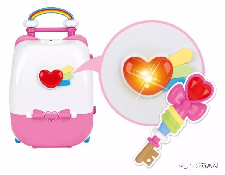 汕头市澄海区联环玩具工艺有限公司出品。产品采用ABS环保无毒原料,搭配鲜艳吸睛的颜色,每个拉杆箱都配以一把造型奇趣可爱的钥匙,采用感应的方式,发出独特专享的乐音。并增加了故事、音乐、儿歌等各种功能。