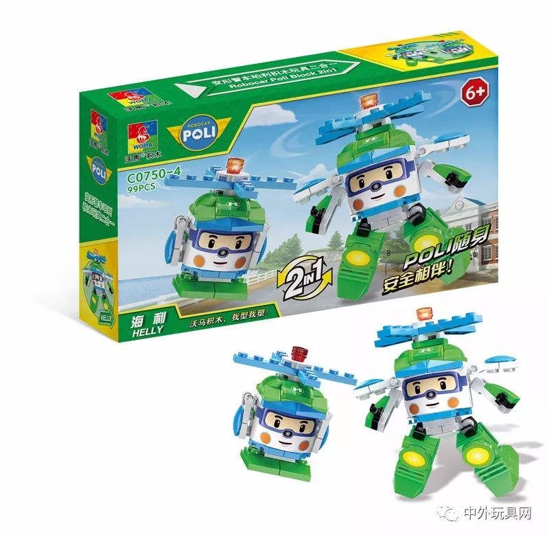 广东沃马动漫玩具有限公司出品。产品以韩国经典教育类动画片《变形警车珀利》为创作背景,真实还原动画片各角色形象。目前研发大小颗粒积木共计25款,产品实现动画片主角变身功能,一款玩具两个玩法。除通过动画片学习交通安全知识,也通过积木玩耍拼装游戏。