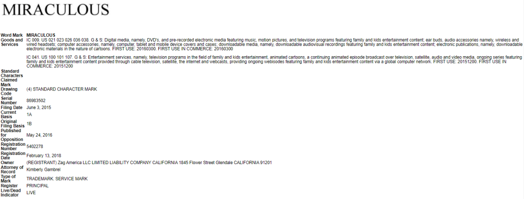 商标MIRACULOUS及相关的动画形象均不可使用: