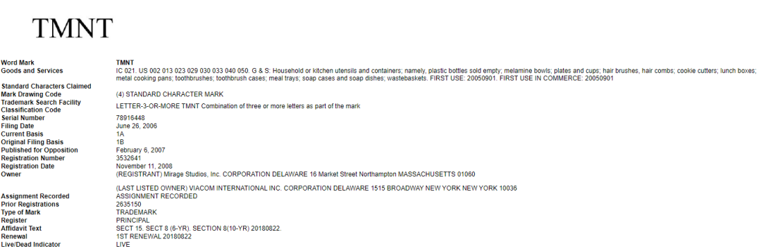 其中需要特别注意TMNT,该商标注册的大类很广,包括09、18、21、24、25、28等等。