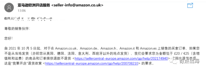 近日,亚马逊欧洲站卖家纷纷表示收到一封亚马逊邮件,邮件中表示自2021年10月5日起,对于在亚马逊英、德、法、意、西五个站点上销售的买家订单,如果不是从当地发货(亦即从英国、德国、法国、意大利、西班牙以外的地点发货),亚马逊会要求我们为金额低于£20/€25(含增值税和运费)的商品和订单提供退款不退货或退货回销售国地址的选项。