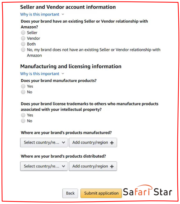 你的品牌是否许可他人使用商标?我在这里会说不,除非你确实愿意,因为你想让亚马逊知道你是唯一一个使用该商标销售产品的人。选择你采购和分销产品的国家,就完成了。