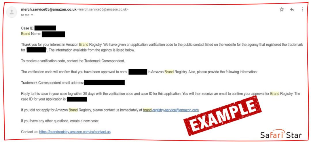 然后亚马逊会发送两封邮件,一封给你,另一封给品牌所有者的邮箱(很可能也是你)。此电子邮件将包含你必须发送到亚马逊的一个代码,以证明品牌所有者已授权你代表该品牌名称。