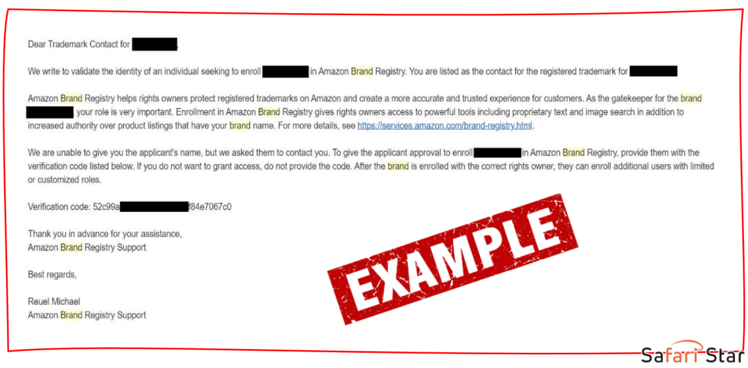 品牌所有者(在大多数情况下也是卖家)将收到以下电子邮件,其中将包含品牌验证码。
