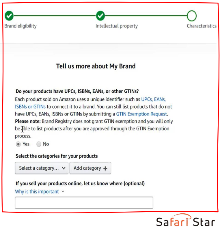 再次强调,现在只能说是,一旦品牌注册获得批准,就要求豁免。你必须提供你的产品类别(即电子产品),并输入你的网站地址。