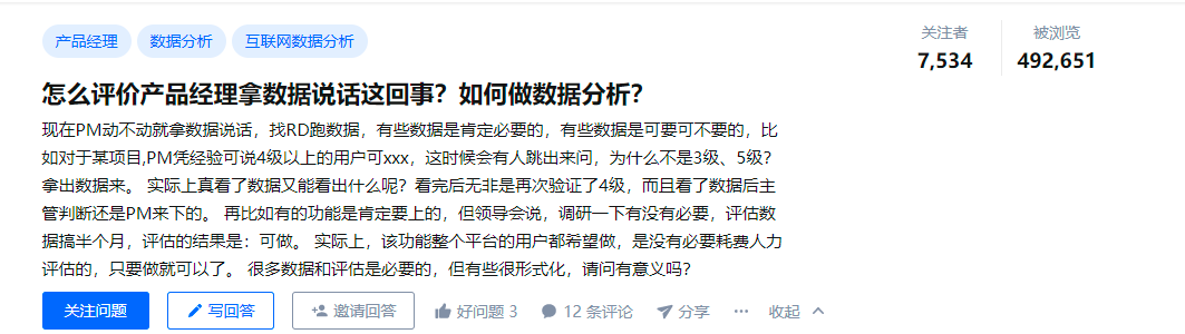 知乎上有一个热门问题 :怎么评价产品经理拿数据说话这回事?如何做数据分析?吸引了7000+关注和140+个回答。