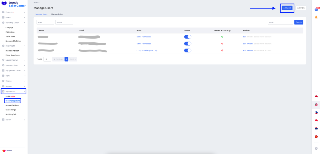 需使用主账户登陆ASC(各国单站点商家后台)-My Account-User Management页面,点击【Add Role】,即可根据实际需求设置自定义子邮箱账户使用权限。