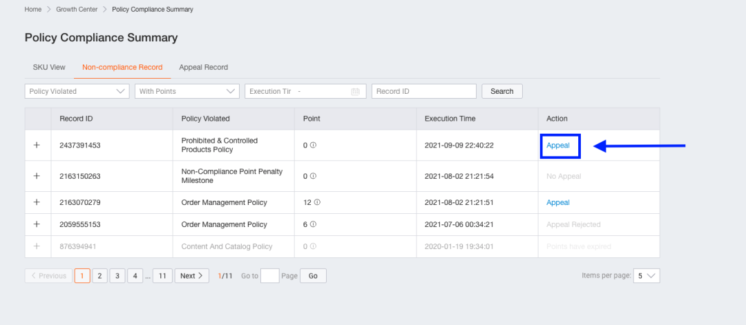路径:数据洞察-平台政策-绩效扣分右下角(点击查看不符合规定记录)-找到对应不符合规定记录进线申诉