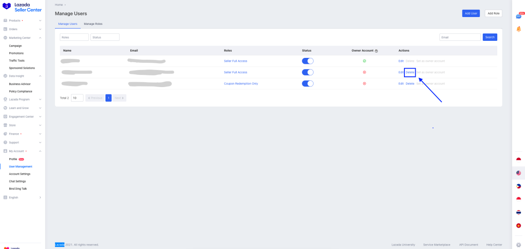 需使用主邮箱账户登陆ASC(各国单站点商家后台)-My Account-User Management页面,点击子账户后面的【Delete】即可,若无法删除成功,请提供完整的操作录屏联系在线客服。