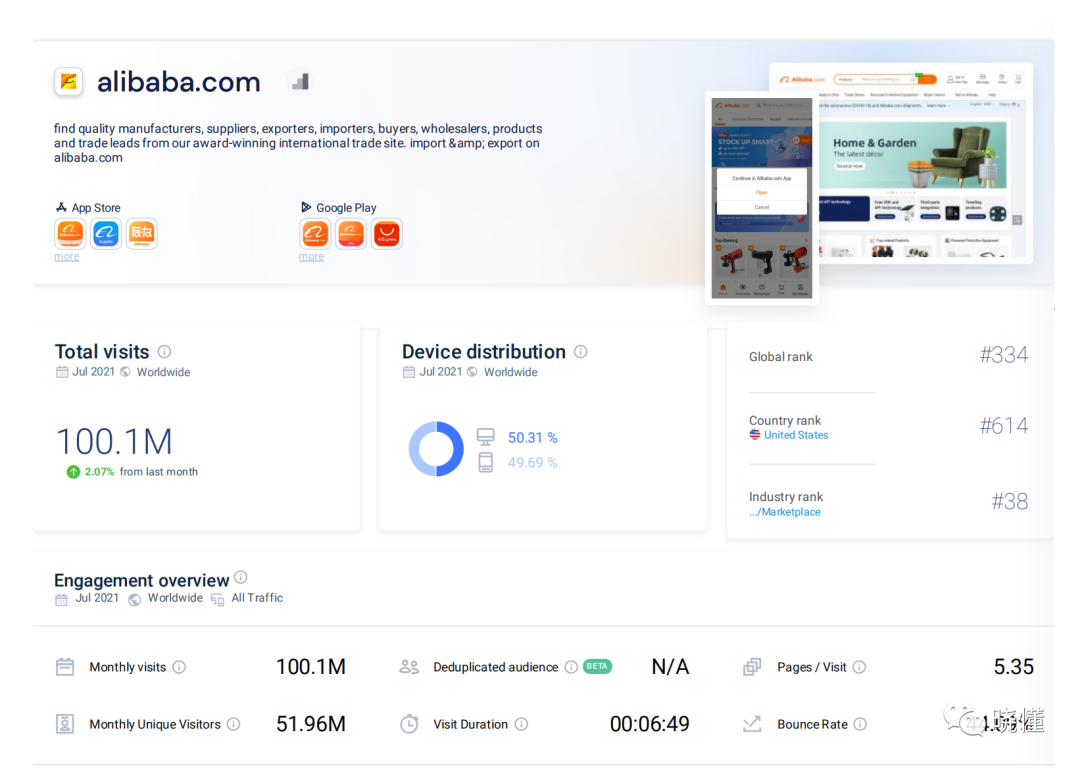 其中很多流量是通过访问速卖通,淘宝,1688等网站之后,再继续跳转到阿里巴巴的网站。速卖通和国际版的淘宝都是B2C的电商平台,相对产品价格更高,不少用户跳转到阿里国际站发现这边批发更加便宜,逐渐就形成了这个流量的路径,这也是我们平时会接触到很多个人使用买家来国际站采购的原因了。