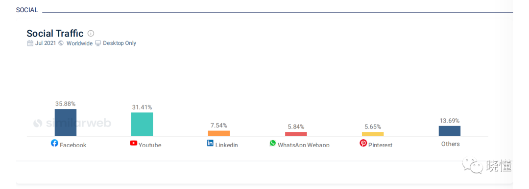 阿里巴巴的社媒流量主要来自Facebook和Youtube,这也是商家在站外最常注册使用的平台,平时还是会经常通过Facebook跟客户聊天,偶尔到Youtube上面发发视频。Linkedin,Whatsapp,Pinterest的流量占比较低,说明商家的数量较少,与前2个平台相比,有流量红利。