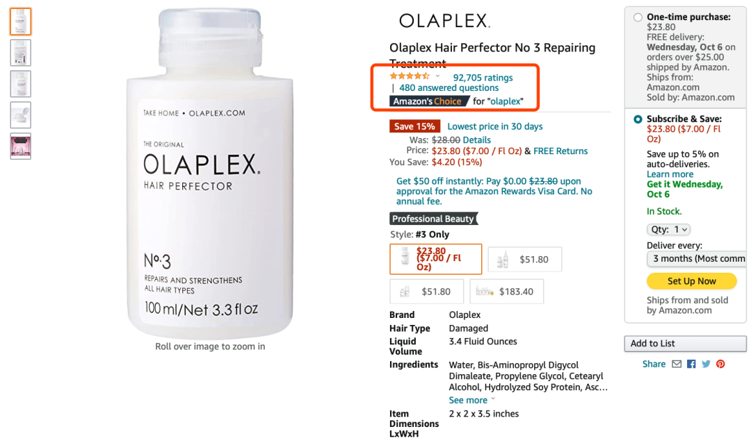 它在亚马逊上可谓非常突出,在个护品类有很不错的表现。"Olaplex Hair Perfector No 3 Repairing Treatment"这个单品,评论数更已经累计了近10万个!
