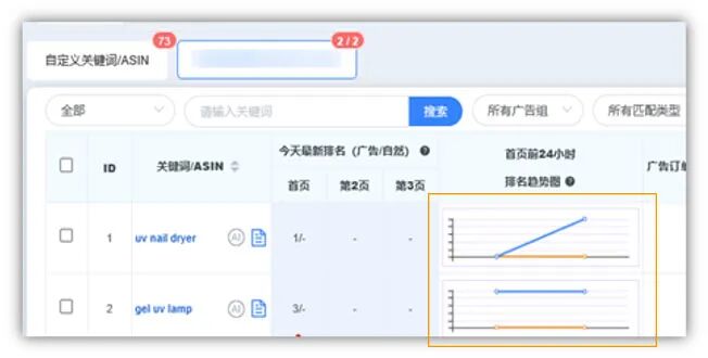 在手动广告期间,沿用自动广告时已有排名的关键词,能帮助该关键词更快地提升排名(如上图是只开启自动广告时关键词的排名和开启手动广告后的排名的对比)。同时我们发现,这款美妆类工具新品的关键词“gel uv lamp”搜索量更高,排名更靠前,应该重点关注。