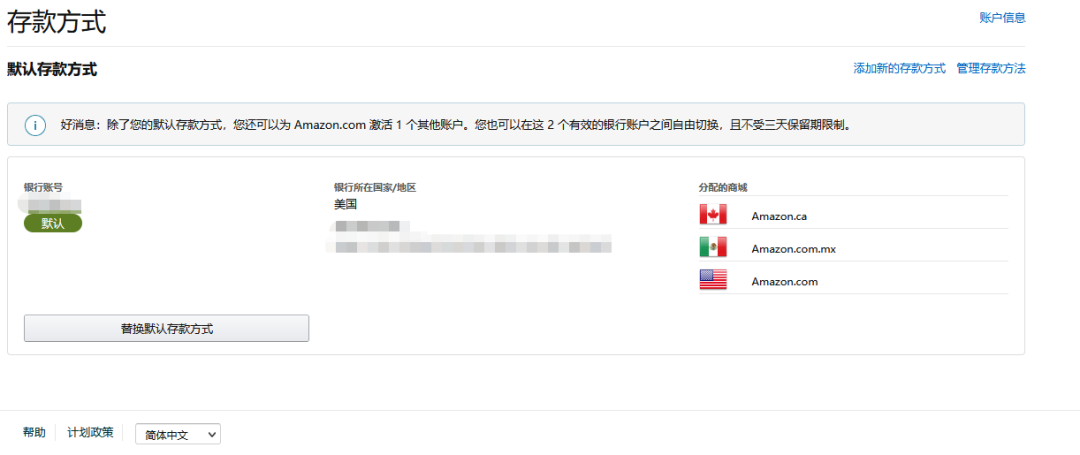 除了卖家的默认存款方式,您还可以为Amazon.com激活1个其他账户。您也可以在这2个有效的银行账户之间自由切换,且不受三天保留期限制。