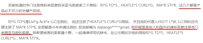 关键词抢注一直有,最近特别多,且似乎都是专门注册来恶意投诉亚马逊卖家。行为之恶劣,已经让卖家呼吁建群请律师写抗辩书,并在公示期异议这些商标。