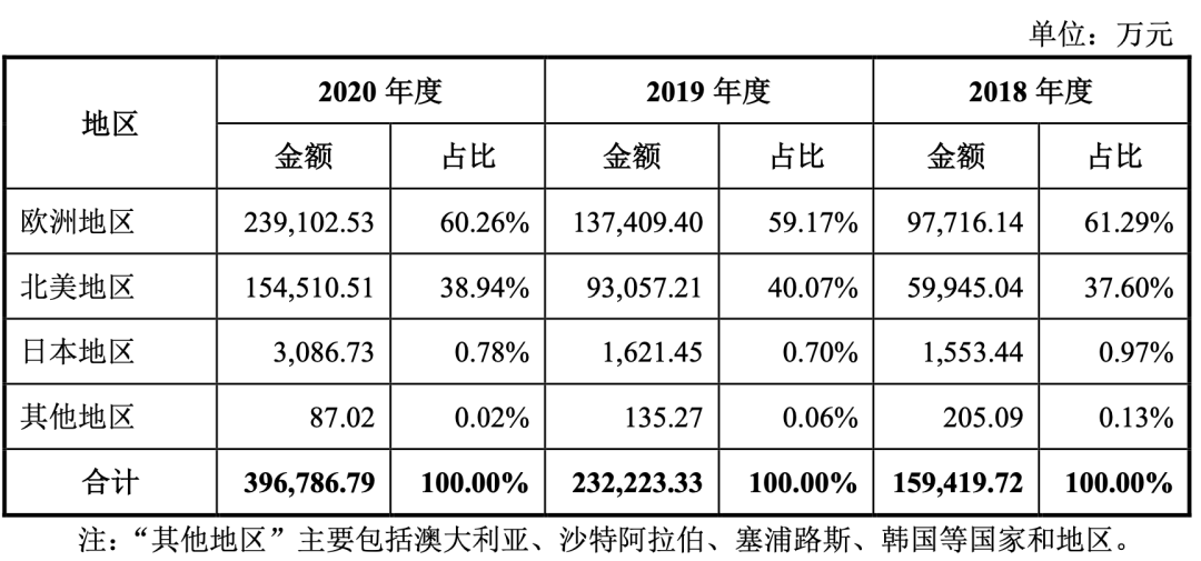 致欧科技主要采取自主研发或合作开发、外协生产的产品供应模式,通过“国内外自营仓+平台仓+ 第三方合作仓”的跨境仓储物流体系,以亚马逊、ManoMano、Cdiscount、eBay 等海外知名电商平台为主要销售渠道,销售范围覆盖欧洲、北美、日本等国家或地区。从致欧科技这个公司名称也能猜出,欧洲是致欧科技最重要的市场,贡献了6成左右收入来源。