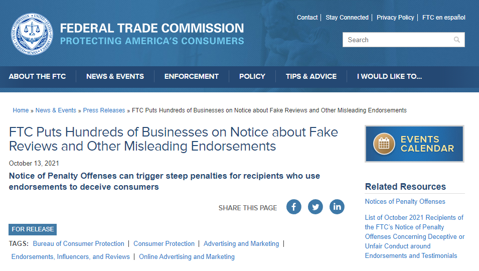 近日,美国联邦贸易委员会(FTC)开始重拳打击网络中的虚假评论,并向亚马逊、沃尔玛、Facebook在内的700多家公司发出警告,提醒他们可能会由于放任虚假评论或从事其他欺骗性行为,从而面临巨额罚款,金额高达43792美元/次。