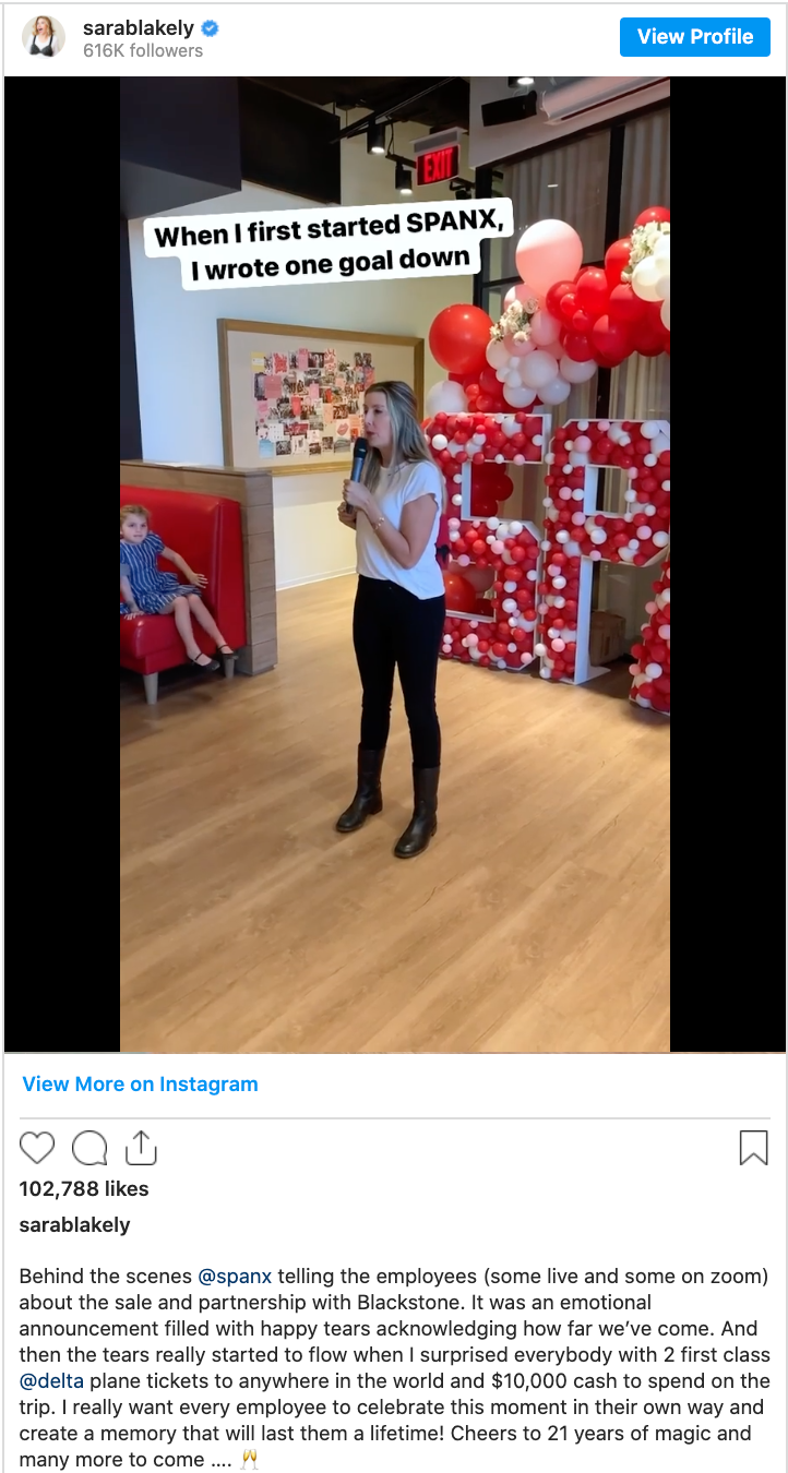 创始人萨拉·布莱克利(Sara Blakely)更是激动地向所有员工宣布,“每个人都有两张前往世界任何地方的头等舱机票,每人都会得到10000美元。”