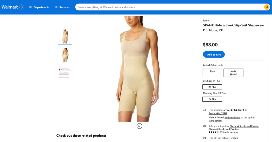 在沃尔玛上,Spanx同样是在相对高值的塑身衣产品中占据排名靠前的位置。