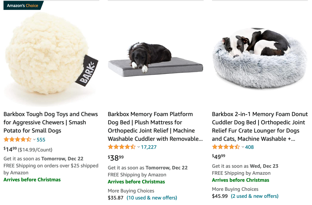 除了通过自有网站销售狗狗装备盒,BarkBox也在亚马逊上销售它的宠物用品,打造了大量爆款产品。亚马逊也成为了BarkBox增长最快的渠道之一!