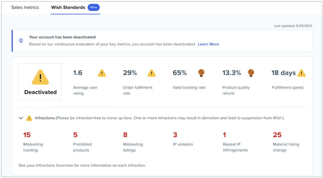 如果店铺存在过多的违规、侵权行为或者表现太差,店铺即会被“停用”。该店铺的产品也就不能继续在Wish上进行销售,同时相关付款也会被暂扣。