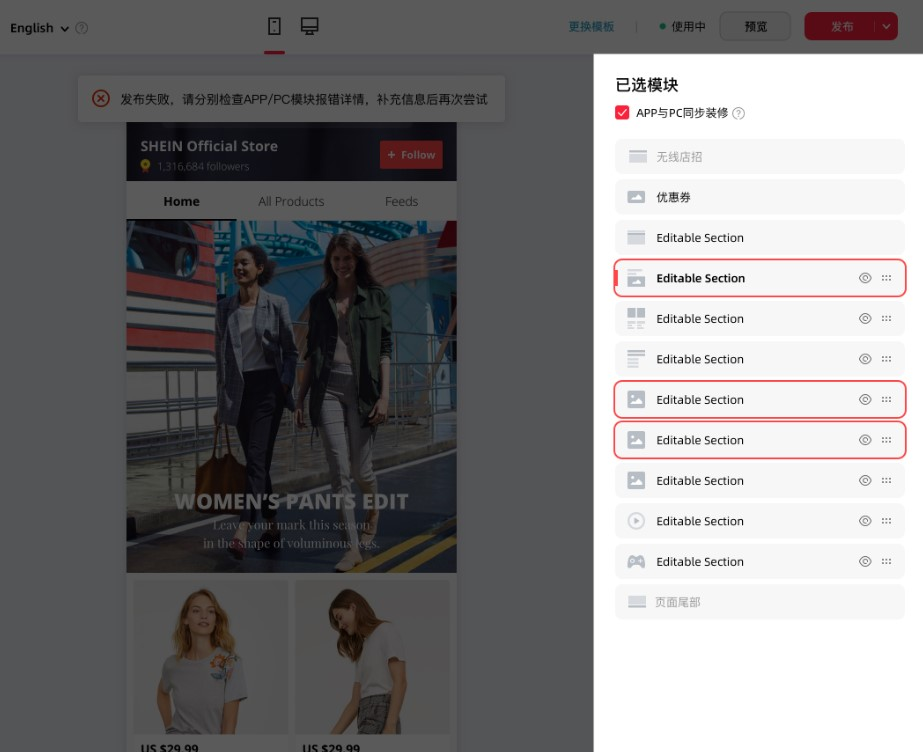 点击APP/PC图标可切换端进行装修,点击发布后的内容包括APP和PC两端内容。