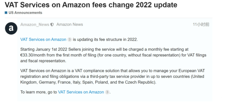 最近亚马逊发布公告,称其在欧洲站提供的VAT增值税服务将会在明年1月1日起,开始征收每月33.3欧元的月费,该功能主要是计算和申报欧洲VAT增值税。