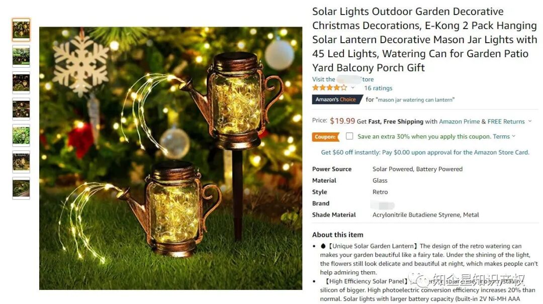 今天在浏览亚马逊的时候,就看到一款太阳能水壶花洒灯,它是美亚站的 Amazon's Choicefor"mason jar watering can lantern",售价19.99美金,留评16颗星。