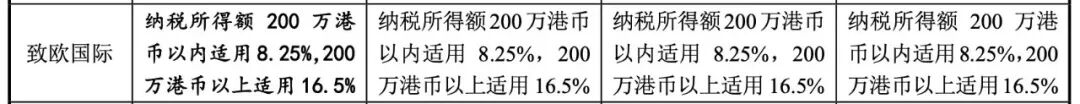 香港公司的利得税率,根据纳税所得额的不同,有两个梯度。例如,郑州跨境电商大卖致欧科技旗下子公司致欧国际是一家香港公司,其在过去三年里,其利得税税率在纳税所得额200万港币以内适用8.25%,200万港币以上适用16.5%