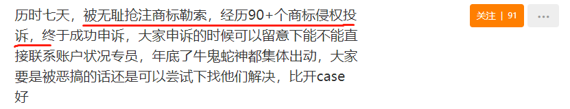 找平台申诉得到的也只是和解或提供商标授权书的无效回复,联系投诉方则被敲诈勒索,拿不到钱转脸就给卖家安排了90+商标投诉,极为狠毒。所幸,卖家通过后台的【联系专员】按钮直接联系绩效团队,成功通过申诉,才免遭毒手。