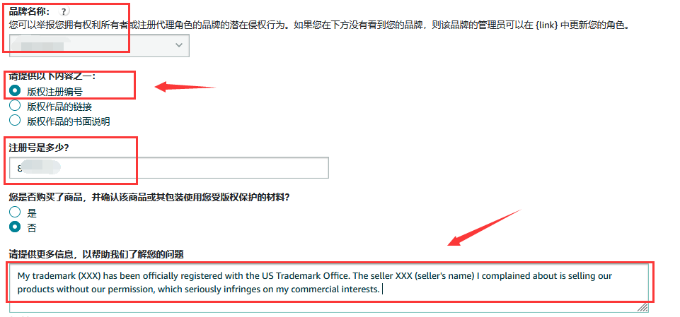 该段的意思就是:我的商标(XXX)已经在美国商标局进行了正式的注册, 我投诉的卖家XXX在未经过我们允许的前提下正在售卖我们的产品,这严重的侵害了我的商业利益。