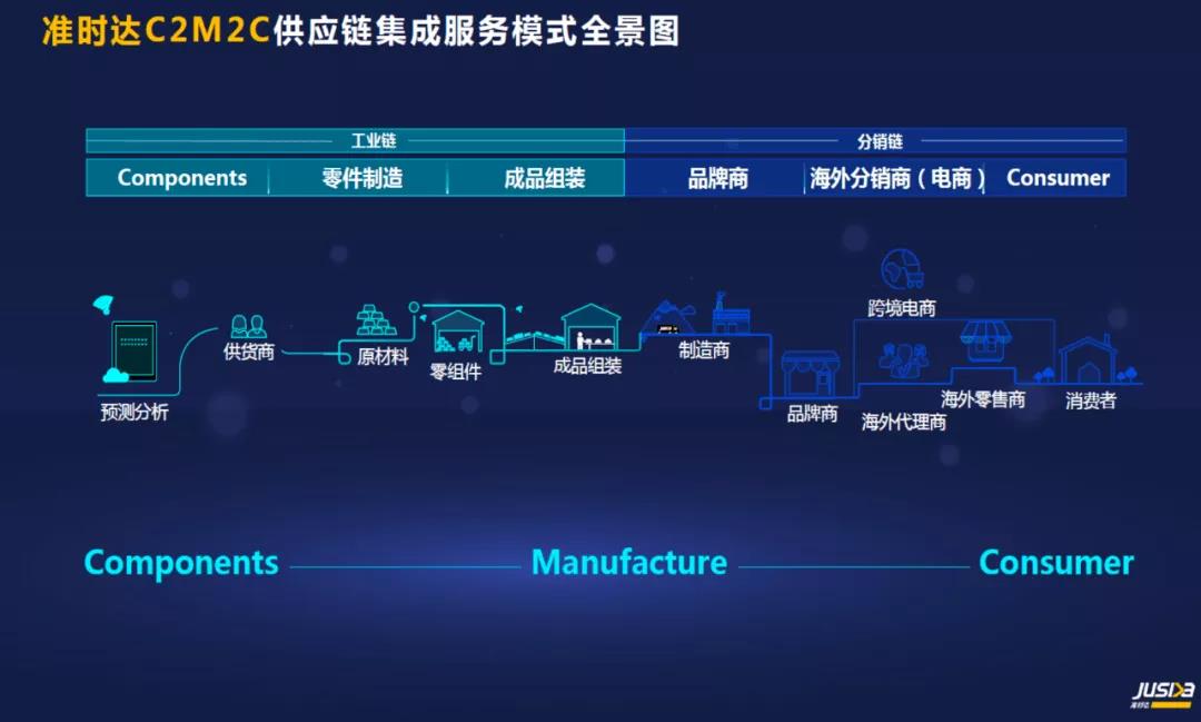 2015年,准时达首次提出C2M2C全流程供应链综合解决方案,即打造从原材料components到生产制造manufacture再到最终客户consumer的端到端供应链管理能力。