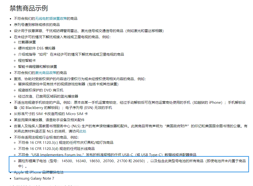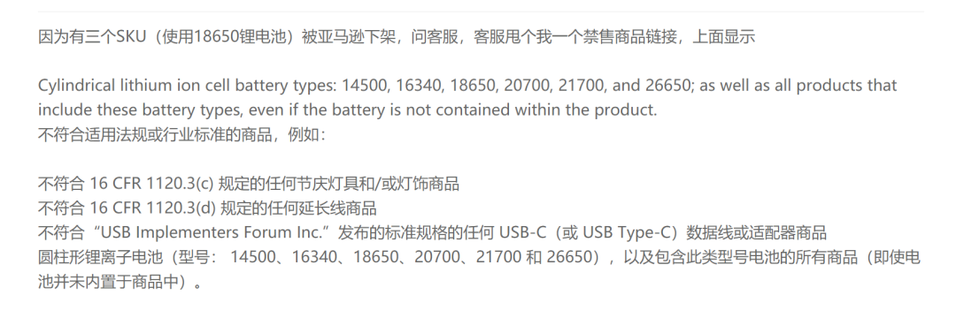 其实,早在去年10月份,就有部分卖家遇到了同一问题,因产品使用18650锂电池被亚马逊下架,咨询客服后得到的回复是禁售商品链接。