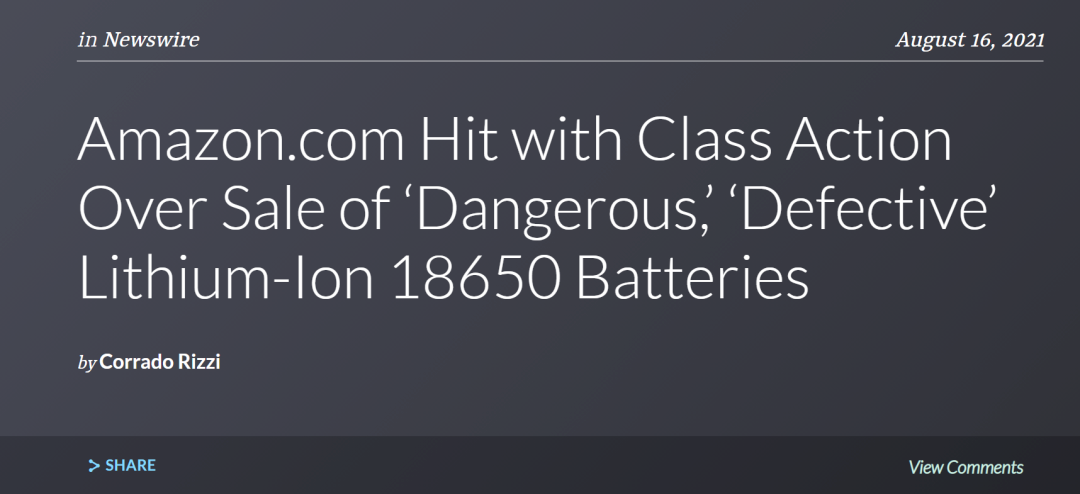 AMZ123了解到,在去年8月份,因平台上有售18650锂电池,亚马逊在华盛顿面临集体诉讼。