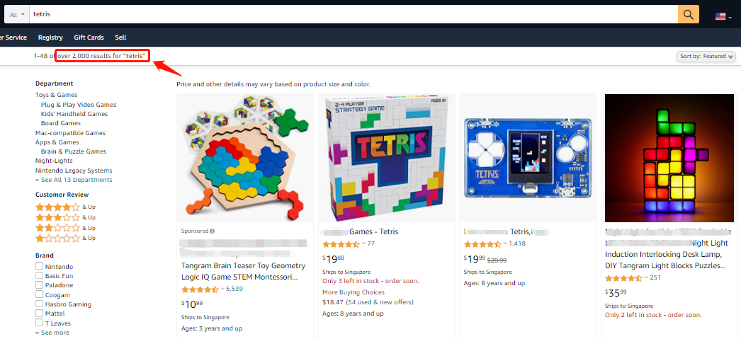 在亚马逊输入Tetris搜索,发现有2000+产品在售,若是在标题、产品描述、产品图片、包装等使用了该词汇,将要直面侵权风险。