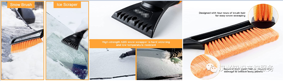 一体ABS塑料铲雪铲冰不伤车,ABS塑料一体成型,坚固耐用,不伤车漆和玻璃;加密毛刷不伤车漆玻璃,优质的尼龙毛刷,韧性强,不伤爱车;加厚海绵手柄防滑不冻手,手柄采用加厚海绵包裹,防滑防冻不伤手;卡扣设计可拆卸易携带,人性化卡扣设计,按需调节,方便携带,不占空间。
