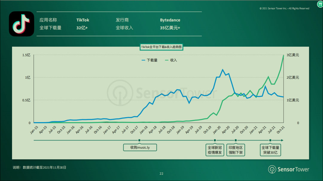 据Sensor Tower商店情报数据显示,截至2021年11月30日,TikTok和抖音在全球App Store和Google Play总下载量已经突破32亿次,成为首款非Facebook系达成此成就的应用。(数据不包括中国及其他地区第三方安卓渠道)